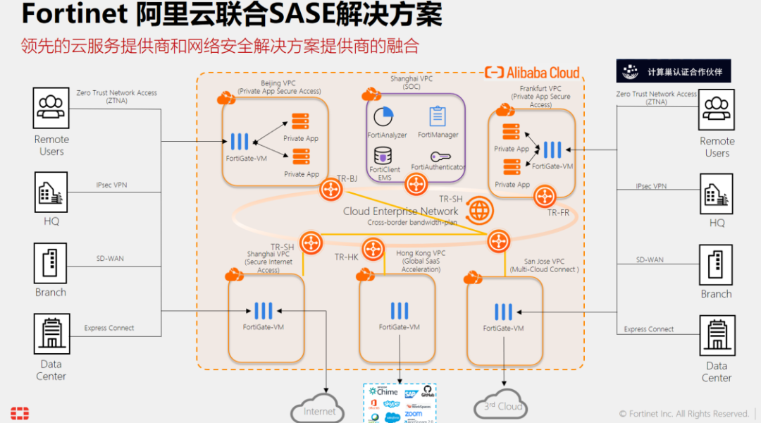 近日,Fortinet 应邀出席第五届 SD-WAN & SASE 峰会。会上,Fortinet 在国内首次公开展示了与阿里云的联合网络安全方案。依托 Fortinet 多维度、多场景的企业级安全能力以及阿里云全球覆盖、弹性可靠、简单易用的云网络基础设施,企业可基于该方案搭建起覆盖多种办公场景、多种网络环境的 SASE 服务,将企业分支机构的办公网络以及数据中心网络、阿里云云网络等,通过 VPN、SD-WAN 或者专线等多种方式连接起来,快速地构建起企业的 “全球一张网” 。